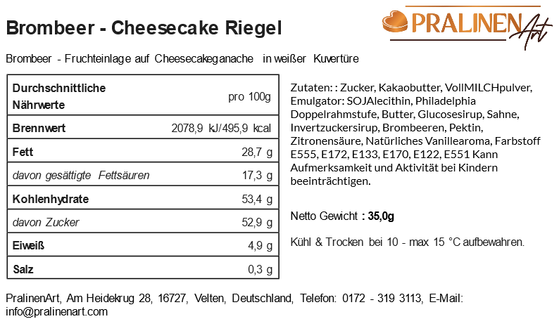 fruchtig frisch gefüllt mit einer Schicht Brombeere auf leckerer Cheesecake-Ganache Ohne Palmöl und ohne künstliche Konservierungsstoffe mit gefärbter Kakaobutter farbig verziert.