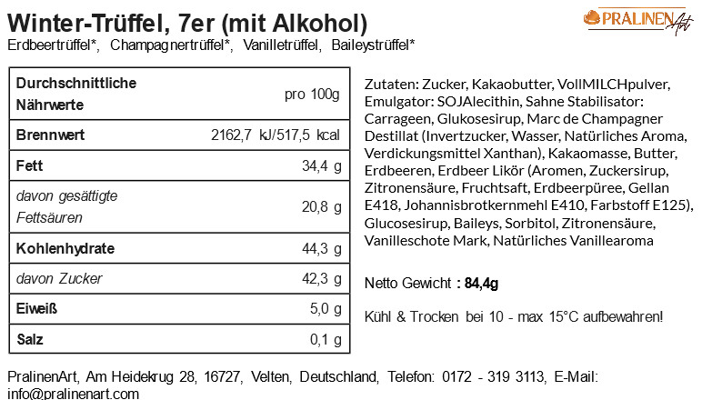 Inhalt 7 aromatische Trüffel. Die Trüffel mit "*" enthalten Alkohol