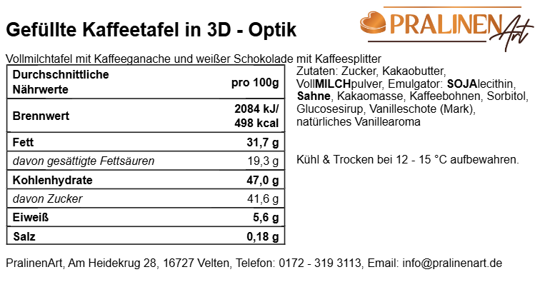 Kaffee Schokoladentafel 3D ausgezeichnet mit Bronze beim German Chocolate AwardSchokoladentafel belgische Schokolade Kaffee gefüllt