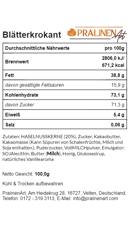 Die Schokoladenhülle ist unglaublich cremig und schmilzt direkt auf der Zunge, während der feinee Kern eine wunderbare Textur hinzufügt. Der Geschmack ist unvergleichlich und verwöhnt den Gaumen mit einer edlen Süße, die einfach glücklich macht. Wer zartschmelzenden Blätterkrokant mag, sollte sich diesen Genuss auf keinen Fall entgehen lassen! Eine klare Empfehlung!